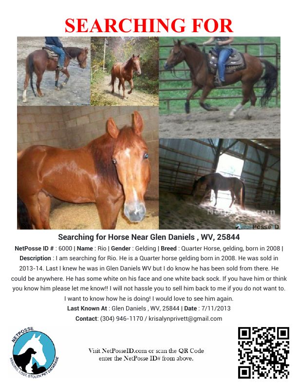 Description: I am searching for Rio. He is a Quarter horse gelding born in 2008. He was sold in 2013-14.
