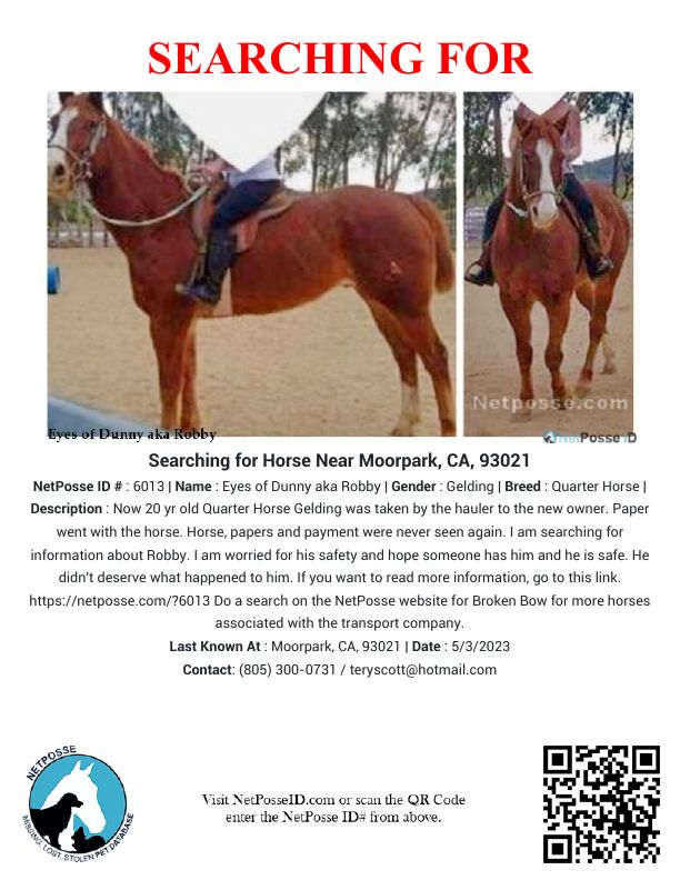 Description: Hauler picked up horse with registration papers to take to new owner. Horse, papers and payment were never seen. Stolen from Moorpark, Ca. summer of 2015.