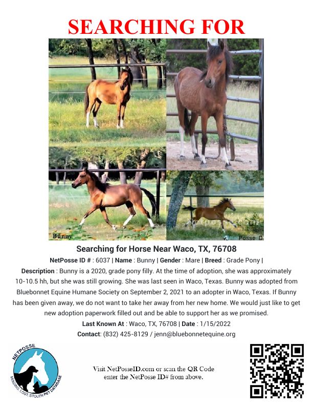 Bunny is a 2020, grade pony filly. At the time of adoption, she was approximately 10-10.5 hh, but she was still growing. She was last seen in Waco, Texas.