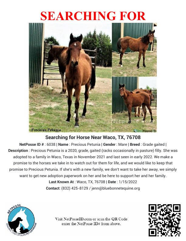 Precious Petunia is a 2020, grade, gaited (racks occasionally in pasture) filly. She was adopted to a family in Waco, Texas in November 2021 and last seen in early 2022.