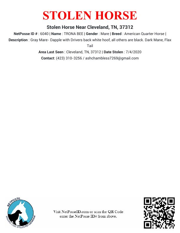 Description: Trona Bee was stolen from Erik Goodwin in Bradley County TN July 2020. Erik called the local police in Bradley County and filed a police report as well as contacted AQHA and flagged her papers. We scoured social media for months trying to find any leads on her as well a horse sales, auctions, etc. Almost 2 years later AQHA contacted Erik stating a man from Ohio had tried to send in transfer of ownership paperwork to get her registered in his name. AQHA provided us with his name and address and told us to contact him. We were informed that it was a civil matter at this point. We then hired an Attorney for legal representation. The man that has her told us he purchased her Athens Livestock in Ohio, and that they purchased several horses that day. We were scheduled for Civil Court. Two days before Court, we were told that he got rid of the horse in February 2023, clearly after he sent verification of her in his possession by providing AQHA with current pictures of Trona Bee. This Mare was born and bred on our farm, and we still have her Aunt and her full sister to her. We just want her home.