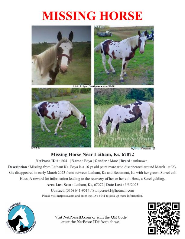 Description: Baya is a 16 yr old rescue paint mare approx 15 hh. She disappeared in early March 2023 from between Latham, Ks and Beaumont, Ks with her grown Sorrel colt Hoss. I found my fence had been cut on the brome field, but she shouldn't have been able to get in that field. These 2 are just pasture pets but are loved very much. I would give a reward for information bringing them home.