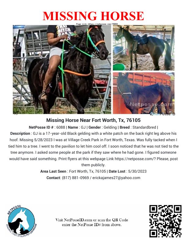 Description: GJ is a 17-year-old Black gelding with a white patch on he back right leg above his hoof. Missing 5/28/2023. I was at Village Creek Park in Fort Worth, Texas. He was fully tacked when I tied him to a tree. I went and sat in the pavilion to let him cool off. At the same time, I was under the pavilion talking. I got up to ride back to my house when I saw he was not tied to the tree anymore. I asked some people at the park if they saw where he had gone. So I called a friend to take me to my car so I could drive around. I figured someone would have said something. I posted yesterday on my Facebook since I had no luck. Print flyers at this webpage Link https://netposse.com/?6088