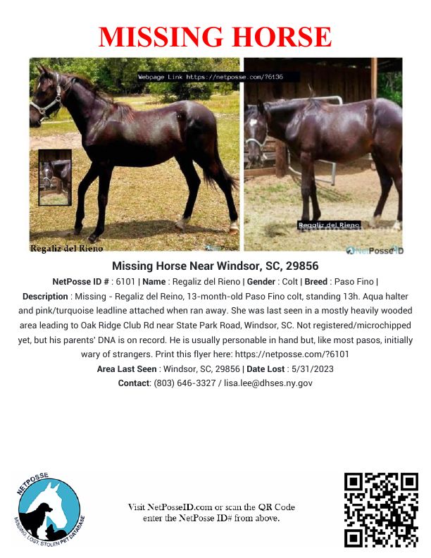 Description: Regaliz del Reino, 13-month-old Paso Fino colt, standing 13h. Aqua halter and pink/turquoise leadline attached when ran away after his 2 yo "buddy" that tends to bully him smashed thru the stall door around a corner, and surprised and charged after us as we were going through a gate. I had to let go but then caught 2yo with feed, and after I contained him in his pasture, the other one, running around along a heavily wooded property line, disappeared (the farm is 50 acres). Only side is not fenced., mostly heavily wooded to Oak Ridge Club Rd.