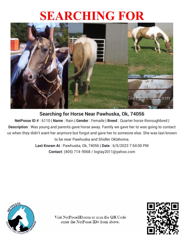 Description: Was young and parents gave horse away. Family we gave her to was going to contact us when they didn't want her anymore but forgot and gave her to someone else. She was last known to be near Pawhuska and Shidler Oklahoma.