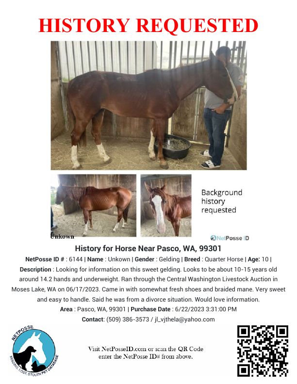 Description: Information on gelding purchased from central washington livestock auction on 06/17/2023