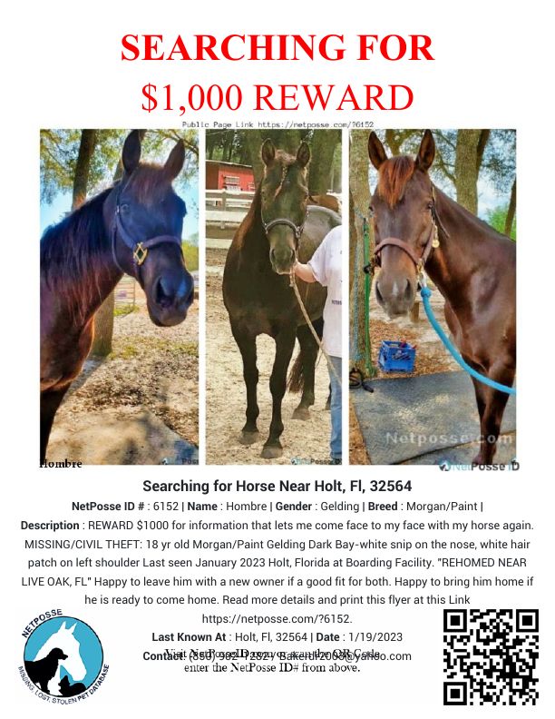 Description: Hombre was under a Lease Agreement with the barn owner I had been boarding him with x 6 years (due to my mother's stroke and needing my time). He would be used for lessons and trail rides to Coldwater or similar in exchange for feed/board/care. The owner decided nine months later that lessons weren't working out, so she "rehomed" him to someone with a pasture near Live Oak, Fl. She notified me through a Facebook messenger account on January 12, knowing I do not use that account. All other important interaction was through my cell phone or e-mail. I didn't see the message for a week. By then, she had already disposed of him and refused to give me any information. Then offered to "try" to get him back, but I wanted $6000 in back fees for the feed/board for the previous nine months. He was a one-person type of horse. He loved me and wasn't very friendly to anyone else, even those who fed him daily. I had great concerns about the safety of anyone unfamiliar with him and voiced this to her. I would like to have him home again, but I will be happy to see him face to face and know he is at a good home and is loved and thriving. If he is, I will bid the new owners farewell and move on.
