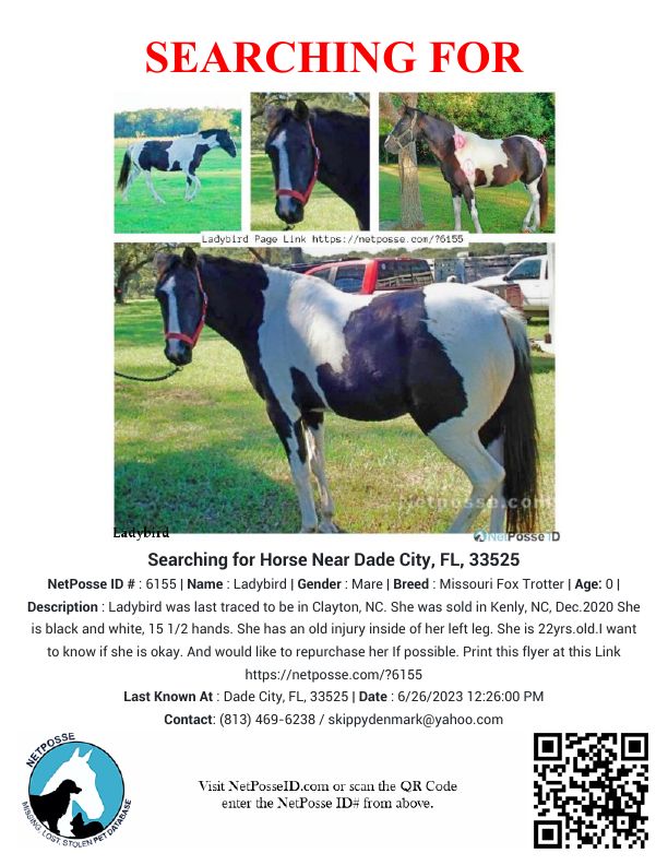 Description: Lady Bird was sold by someone I know in Dec.2020 in Kenly, NC, and last known to be in Clayton, NC. She has an old injury on the inside of her left leg. She is 15 1/2 Hands. She is black and white. She is 22yrs.old. I want to know if she is okay. And would like to repurchase her If possible.