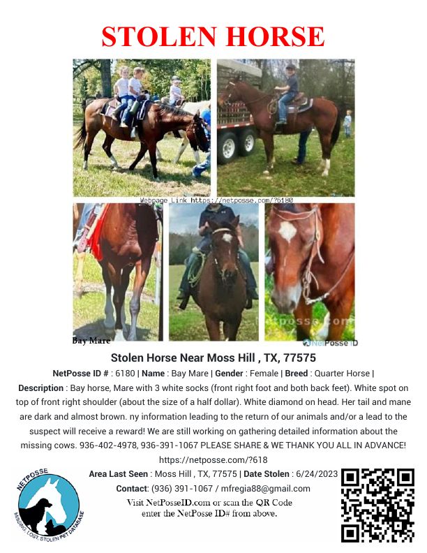 Description: Bay horse, Mare with 3 white socks (front right foot and both back feet). White spot on top of front right shoulder (about the size of a half dollar). White diamond on the head. Her tail and mane are dark and almost brown. Our horse along with some of our cows were stolen from our land at 3301 HWY 105 West in Moss Hill within the past week. Any information leading to the return of our animals and/or a lead to the suspect will receive a reward! We are still working on gathering detailed information about the missing cows.