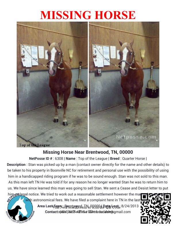 Description: Stan was picked up by a man (contact owner directly for the name and other details) to be taken to his property in Boonville NC for retirement and personal use with the possibility of using him in a handicapped riding program if he was to be sound enough. Stan was not sold to this man. As this man left TN He was told if for any reason he no longer wanted Stan he was to return him to us. We have since learned this man was going to sell Stan. We sent a Cease and Desist letter to put him on legal notice. We tried to work out a reasonable settlement however the man only responded with astronomical fees. We have filed a complaint here in TN in the last week.