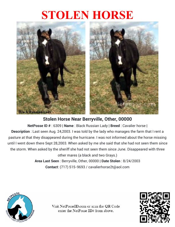 Description: Last seen Aug. 24,2003. I was told by the lady who manages the farm that I rent a pasture at that they disappeared during the hurricane. I was not informed about the horse missing until I went down there Sept 28,2003. When asked by me she said that she had not seen them since the storm. When asked by the sheriff she had not seen them since June. Disappeared with three other mares (a black and two Grays.)
