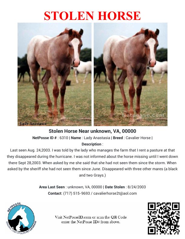 Description: Last seen Aug. 24,2003. I was told by the lady who manages the farm that I rent a pasture at that they disappeared during the hurricane. I was not informed about the horse missing until I went down there Sept 28,2003. When asked by me she said that she had not seen them since the storm. When asked by the sheriff she had not seen them since June. Disappeared with three other mares (a black and two Grays.)