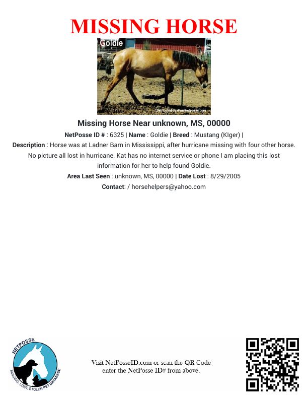 Description: Horse was at Ladner Barn in Mississippi, after hurricane missing with four other horse. No picture all lost in hurricane. Kat has no internet service or phone I am placing this lost information for her to help found Goldie.
