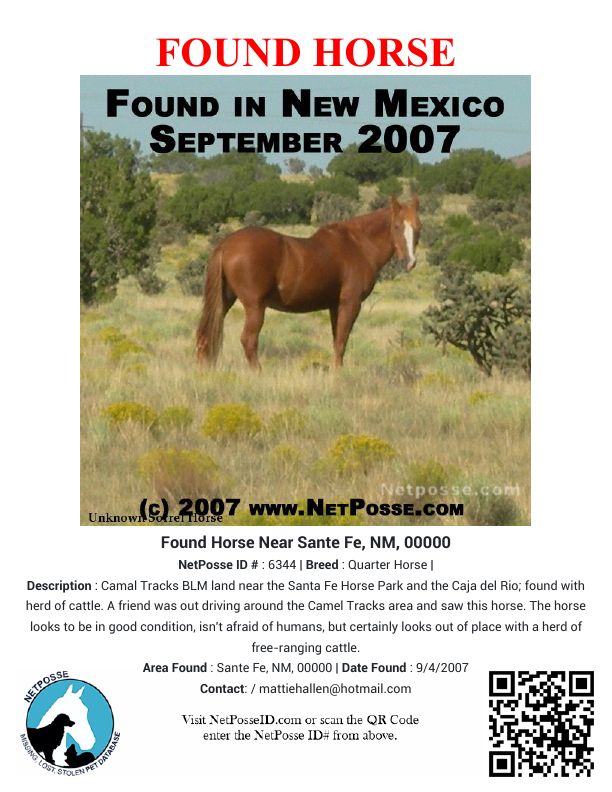 Description: Camal Tracks BLM land near the Santa Fe Horse Park and the Caja del Rio; found with herd of cattle. A friend was out driving around the Camel Tracks area and saw this horse. The horse looks to be in good condition, isn't afraid of humans, but certainly looks out of place with a herd of free-ranging cattle.