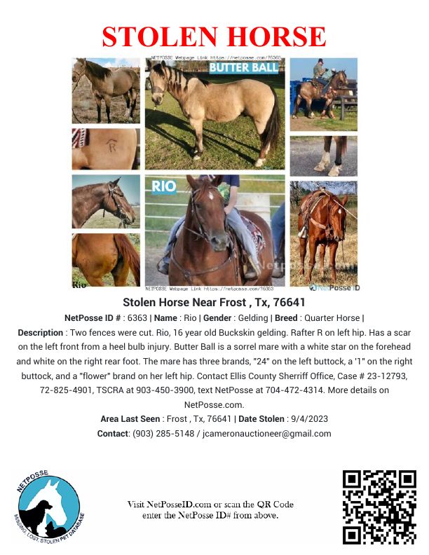 Anyone with information on this case is urged to contact Robert Pemberton at 903-450-3900 or the Operation Cow Thief tip line at 817-916-1775. You can also text Stolen Horse International, NetPosse, at 704-472-4314 or me. You can also contact the Ellis County Sheriff's Office in Waxahachie, Texas, at 972-825-4901.
