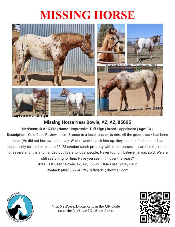 ON THIS DAY IN TIME, NETPOSSE COLD CASE REVIEW. This report is still open in our NetPosse database on our website. You can read the details on this cold case and contact the owner by clicking on the image below. Could you please pass the cold case NetPosse Alert along as many times as you can? As many of you know, we've helped recover horses over a decade after they went missing. We never give up. We appreciate your support.