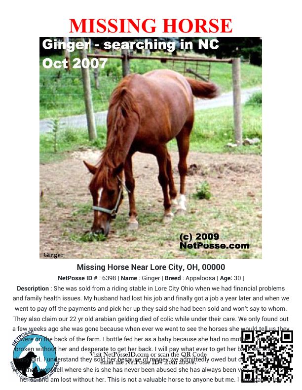 Description: She was sold from a riding stable in Lore City Ohio when we had financial problems and family health issues. My husband had lost his job and finally got a job a year later and when we went to pay off the payments and pick her up they said she had been sold and won't say to whom. They also claim our 22 yr old arabian gelding died of colic while under their care. We only found out a few weeks ago she was gone because when ever we went to see the horses she would tell us they were on the back of the farm. I bottle fed her as a baby because she had no mother. I am heart broken without her and desperate to get her back. I will pay what ever to get her back … she's my baby girl. I understand they sold her because of money we admittedly owed but don't understand why they wont tell where she is she has never been abused she has always been very spoiled. I love her so and am lost without her. This is not a valuable horse to anyone but me. I only paid a few hundred dollars for her but to me she is PRICELESS.