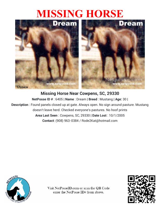 Description: Found panels closed up at gate. Always open. No sign around pasture. Mustang doesn't leave herd. Checked everyone's pastures. No hoof prints