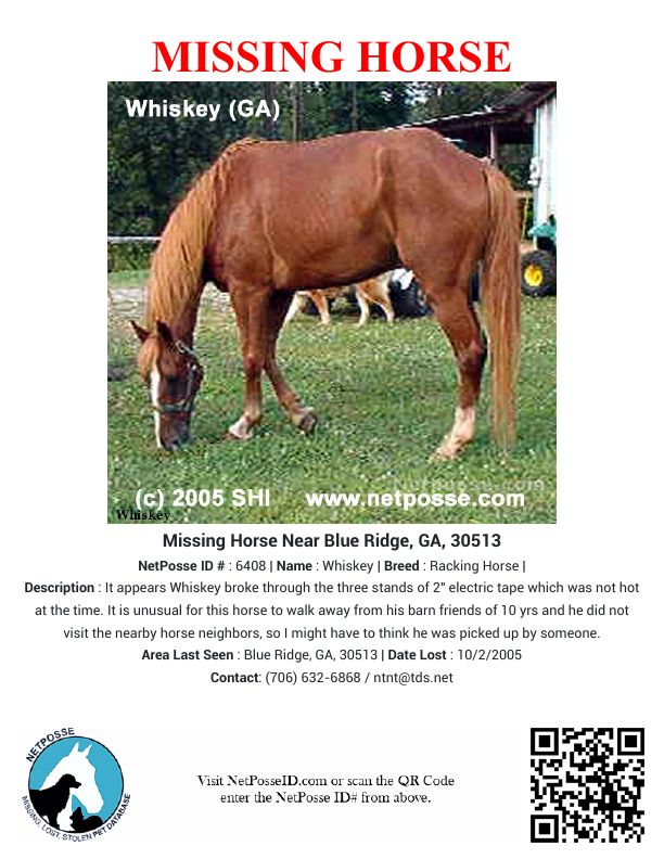 Description: It appears Whiskey broke through the three stands of 2" electric tape which was not hot at the time. It is unusual for this horse to walk away from his barn friends of 10 yrs and he did not visit the nearby horse neighbors, so I might have to think he was picked up by someone.