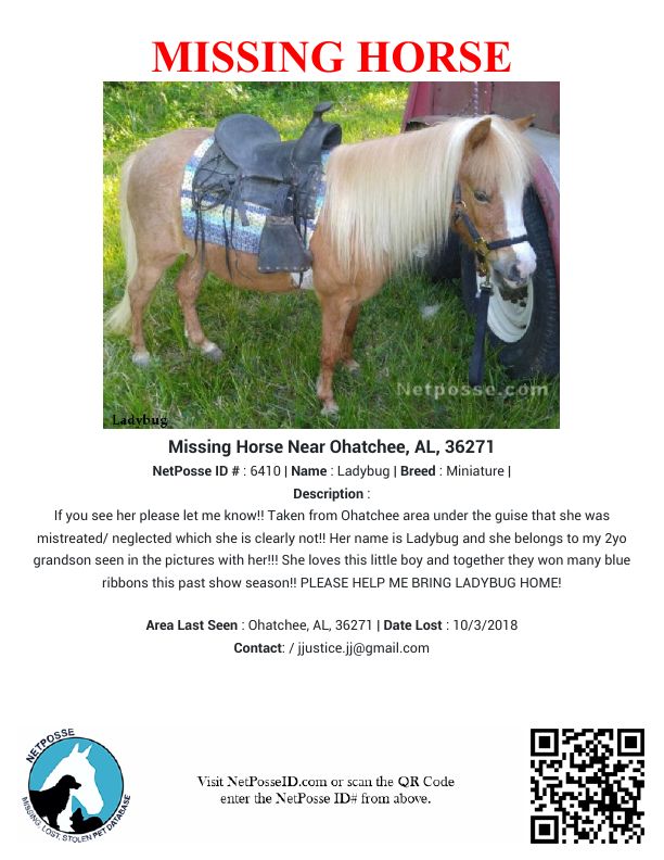 Description: If you see her please let me know!! Taken from Ohatchee area under the guise that she was mistreated/ neglected which she is clearly not!! Her name is Ladybug and she belongs to my 2yo grandson seen in the pictures with her!!! She loves this little boy and together they won many blue ribbons this past show season!! PLEASE HELP ME BRING LADYBUG HOME!