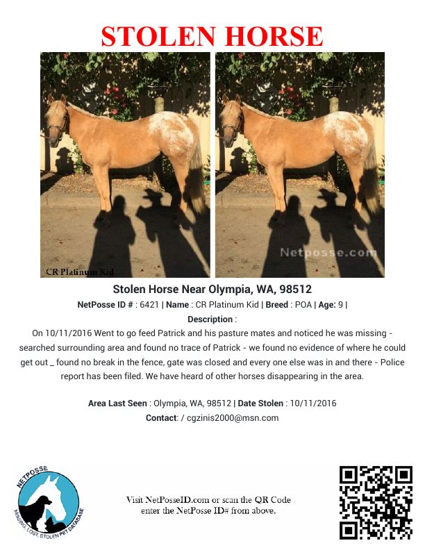 Description: On 10/11/2016 Went to go feed Patrick and his pasture mates and noticed he was missing - searched surrounding area and found no trace of Patrick - we found no evidence of where he could get out _ found no break in the fence, gate was closed and every one else was in and there - Police report has been filed. We have heard of other horses disappearing in the area.