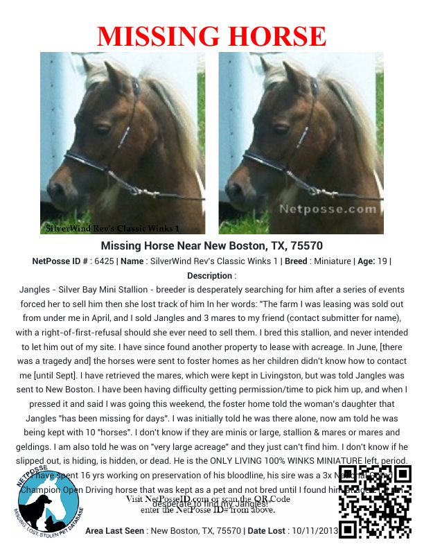 Description: Jangles - Silver Bay Mini Stallion - breeder is desperately searching for him after a series of events forced her to sell him then she lost track of him In her words: "The farm I was leasing was sold out from under me in April, and I sold Jangles and 3 mares to my friend (contact submitter for name), with a right-of-first-refusal should she ever need to sell them. I bred this stallion, and never intended to let him out of my site. I have since found another property to lease with acreage. In June, [there was a tragedy and] the horses were sent to foster homes as her children didn't know how to contact me [until Sept]. I have retrieved the mares, which were kept in Livingston, but was told Jangles was sent to New Boston. I have been having difficulty getting permission/time to pick him up, and when I pressed it and said I was going this weekend, the foster home told the woman's daughter that Jangles "has been missing for days". I was initially told he was there alone, now am told he was being kept with 10 "horses". I don't know if they are minis or large, stallion & mares or mares and geldings. I am also told he was on "very large acreage" and they just can't find him. I don't know if he slipped out, is hiding, is hidden, or dead. He is the ONLY LIVING 100% WINKS MINIATURE left, period. I have spent 16 yrs working on preservation of his bloodline, his sire was a 3x National Grand Champion Open Driving horse that was kept as a pet and not bred until I found him at age 21. I am desperate to find my Jangles!"