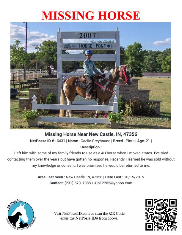 Missing Horse named Gaelic Greyhound - New Castle, IN, 47356 #6431