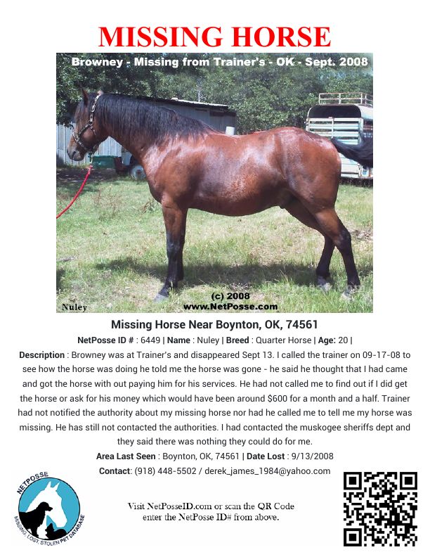 Description: Browney was at Trainer's and disappeared Sept 13. I called the trainer on 09-17-08 to see how the horse was doing he told me the horse was gone - he said he thought that I had came and got the horse with out paying him for his services. He had not called me to find out if I did get the horse or ask for his money which would have been around $600 for a month and a half. Trainer had not notified the authority about my missing horse nor had he called me to tell me my horse was missing. He has still not contacted the authorities. I had contacted the muskogee sheriffs dept and they said there was nothing they could do for me.