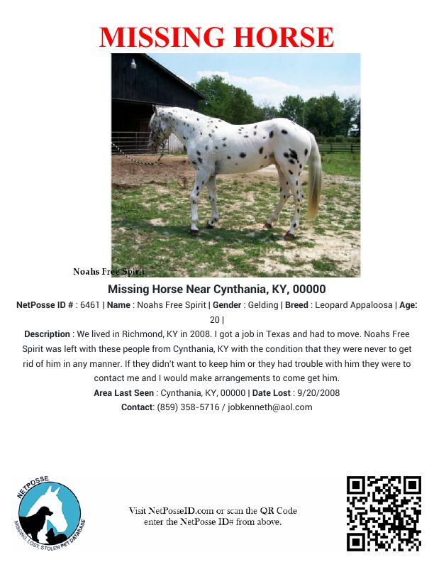 Description: We lived in Richmond, KY in 2008. I got a job in Texas and had to move. Noahs Free Spirit was left with these people from Cynthania, KY with the condition that they were never to get rid of him in any manner. If they didn't want to keep him or they had trouble with him they were to contact me and I would make arrangements to come get him. They had all my phone numbers as well as email addresses. We also have a mutual friend who they could have gotten our numbers from, since they said they lost our number. We called them several times and got no answer and left messages but got no response except one time, and they said Noah was doing great and that they were happy with him. We continued to attempt to keep in touch after that but to no avail. They didn't answer calls nor return calls or messages. We learned they had gotten rid of Noah (not sure if they gave him away or sold him) through Facebook. She admitted she had gotten rid of Noah. I have all of the correspondences between us from Facebook. She didn't give me the name of who has him now or where he is except that a friend she works with has him.