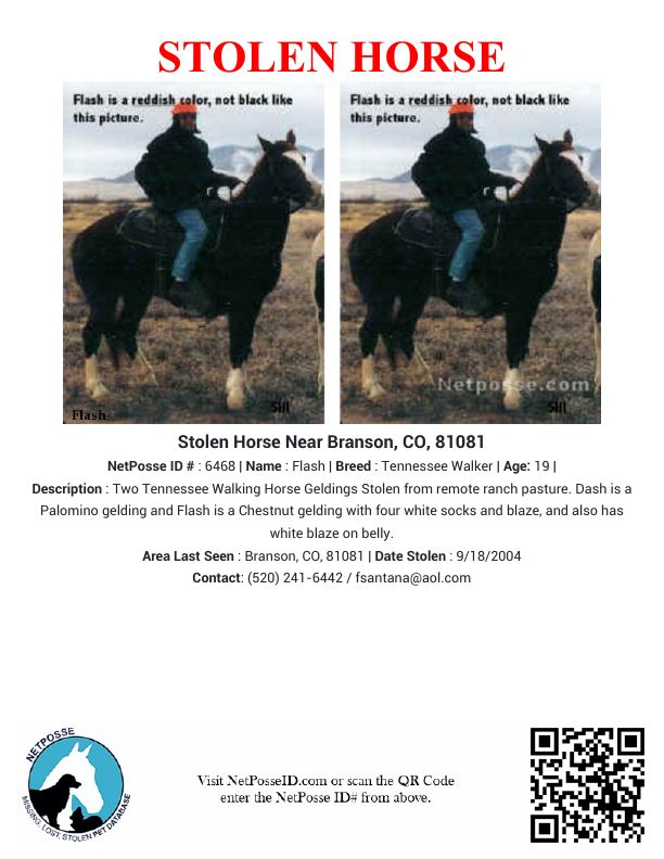 Description: Two Tennessee Walking Horse Geldings Stolen from remote ranch pasture. Dash is a Palomino gelding and Flash is a Chestnut gelding with four white socks and blaze, and also has white blaze on belly.