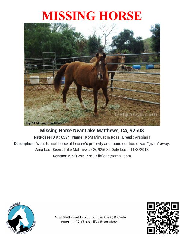 Description: Went to visit horse at Lessee's property and found out horse was "given" away.