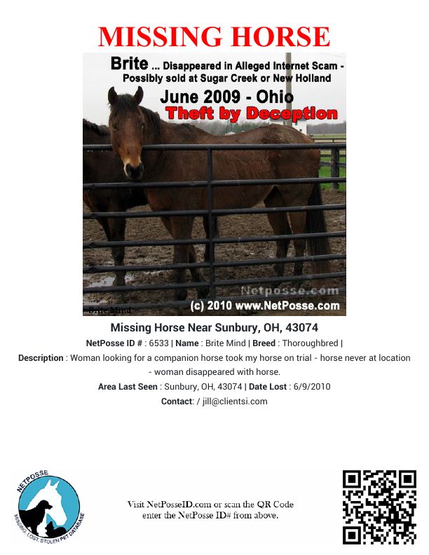 Description: Woman looking for a companion horse took my horse on trial - horse never at location - woman disappeared with horse.