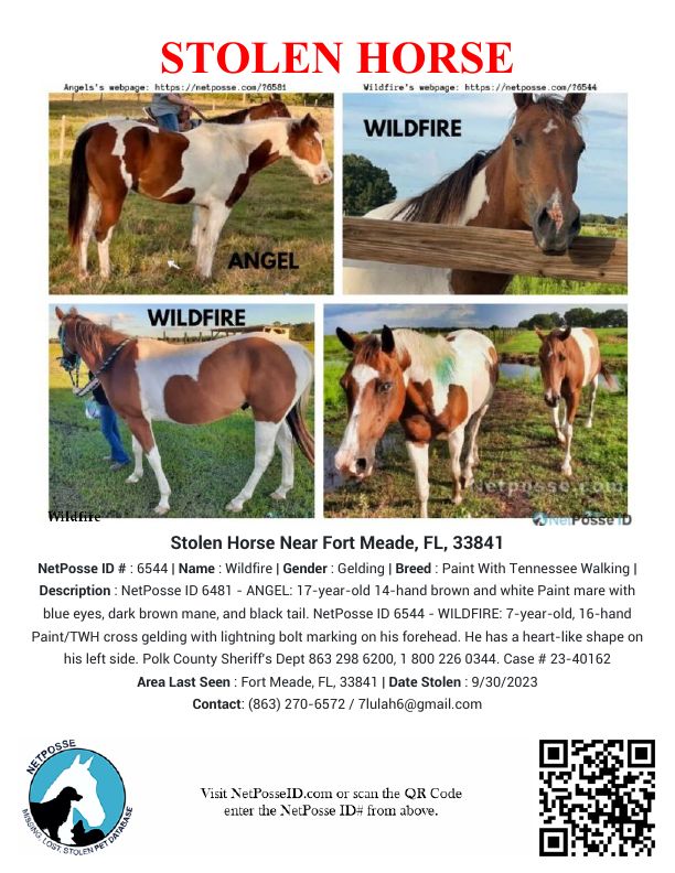 Description: PLEASE KEEP YOUR EYES AND EARS OPEN AS THESE TWO HORSES WERE STOLEN TODAY! PLEASE ALSO SHARE THIS POST AS MUCH AS POSSIBLE! They were pastured at E Bereah Rd & Avon Park Cutoff in Ft. Meade. On Saturday, 9/30 time, between 830 a.m. & 330 p.m., someone cut the fence and stole them both. One is a 17-year-old mare with blue eyes. The other is a 7-year-old gelding with brown eyes. The gelding's name is Wildfire, and he recognizes and comes to his name. He has a lightning bolt between his eyes and a heart shape on his left side. The child these horses belong to is beyond devastated and needs her babies back. Please let me know if you see or hear anything, regardless of how relevant it may seem. I don't care what time of day or night it is. You can message me here or call/message my cell at 863-289-1025. Every tip will be immediately forwarded to law enforcement. PLEASE, PLEASE SHARE!!!