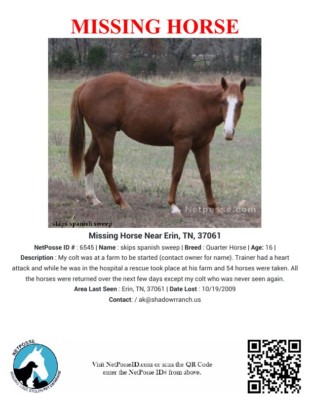 Description: My colt was at a farm to be started (contact owner for name). Trainer had a heart attack and while he was in the hospital a rescue took place at his farm and 54 horses were taken. All the horses were returned over the next few days except my colt who was never seen again.
