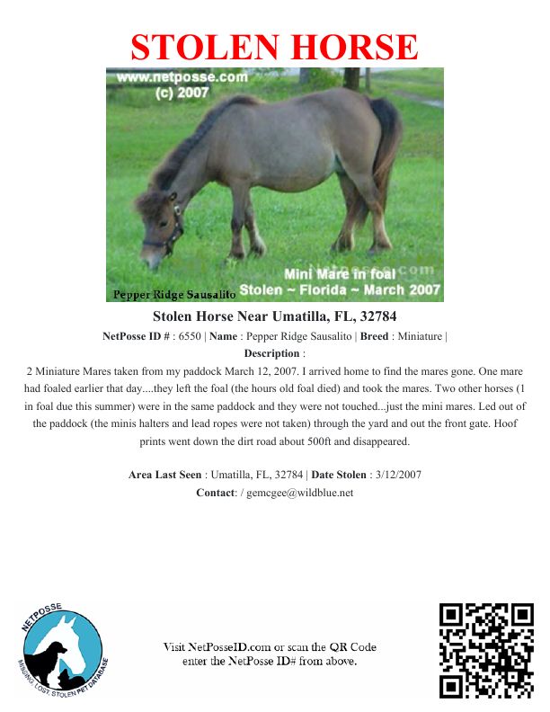 Description: 2 Miniature Mares taken from my paddock March 12, 2007. I arrived home to find the mares gone. One mare had foaled earlier that day....they left the foal (the hours old foal died) and took the mares. Two other horses (1 in foal due this summer) were in the same paddock and they were not touched...just the mini mares. Led out of the paddock (the minis halters and lead ropes were not taken) through the yard and out the front gate. Hoof prints went down the dirt road about 500ft and disappeared.