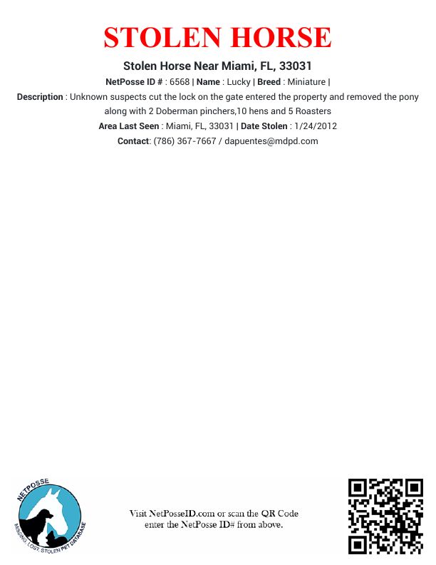 Description: Unknown suspects cut the lock on the gate entered the property and removed the pony along with 2 Doberman pinchers,10 hens and 5 Roasters