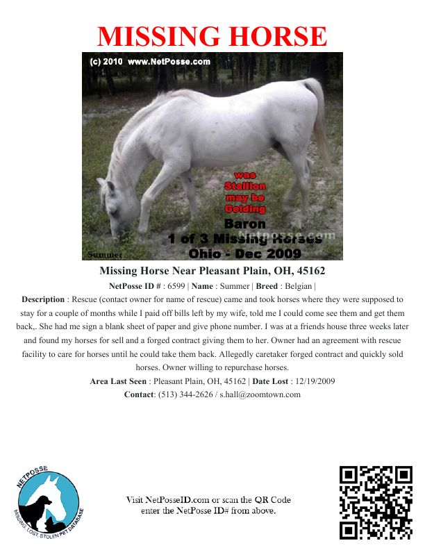 Description: Rescue (contact owner for name of rescue) came and took horses where they were supposed to stay for a couple of months while I paid off bills left by my wife, told me I could come see them and get them back,. She had me sign a blank sheet of paper and give phone number. I was at a friends house three weeks later and found my horses for sell and a forged contract giving them to her. Owner had an agreement with rescue facility to care for horses until he could take them back. Allegedly caretaker forged contract and quickly sold horses. Owner willing to repurchase horses.