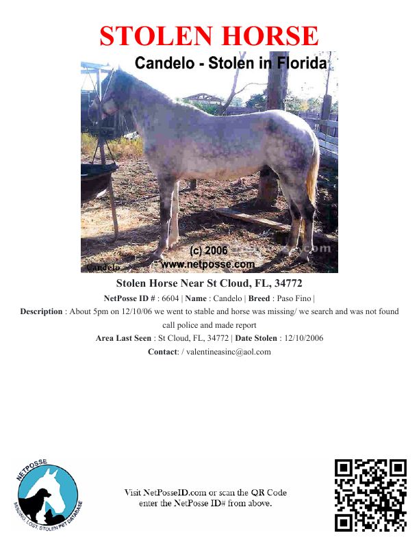 Description: About 5pm on 12/10/06 we went to stable and horse was missing/ we search and was not found call police and made report