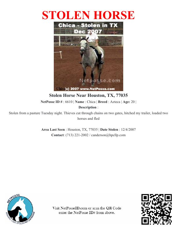 Description: Stolen from a pasture Tuesday night. Thieves cut through chains on two gates, hitched my trailer, loaded two horses and fled