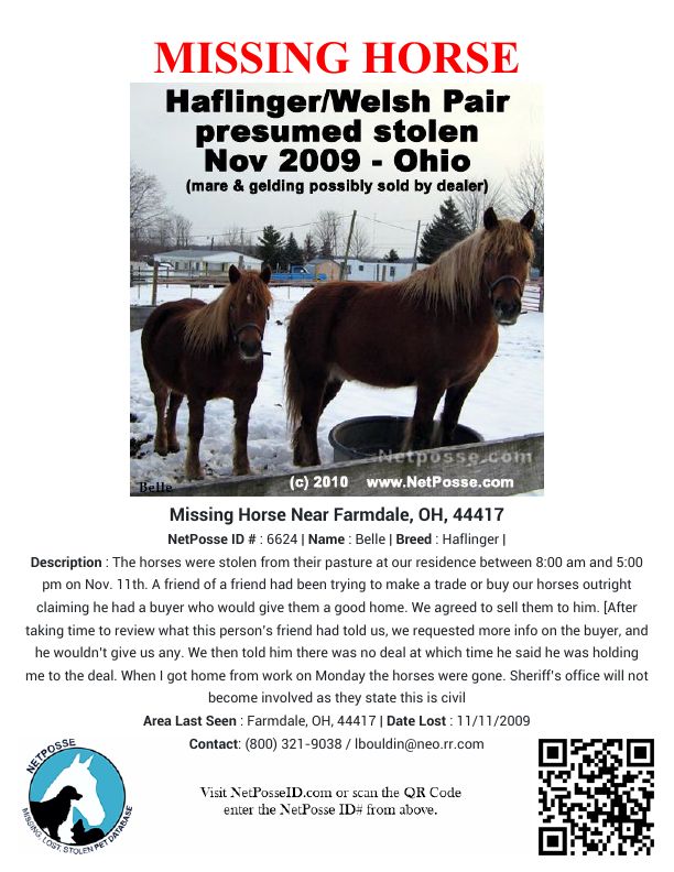 Description: The horses were stolen from their pasture at our residence between 8:00 am and 5:00 pm on Nov. 11th. A friend of a friend had been trying to make a trade or buy our horses outright claiming he had a buyer who would give them a good home. We agreed to sell them to him. [After taking time to review what this person’s friend had told us, we requested more info on the buyer, and he wouldn’t give us any. We then told him there was no deal at which time he said he was holding me to the deal. When I got home from work on Monday the horses were gone. Sheriff’s office will not become involved as they state this is civil