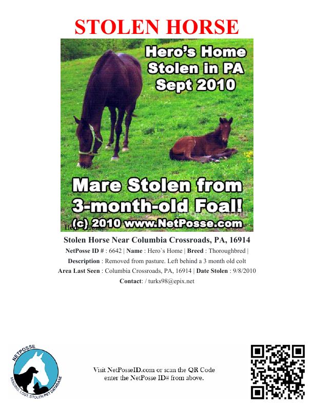 Description: Removed from pasture. Left behind a 3 month old colt