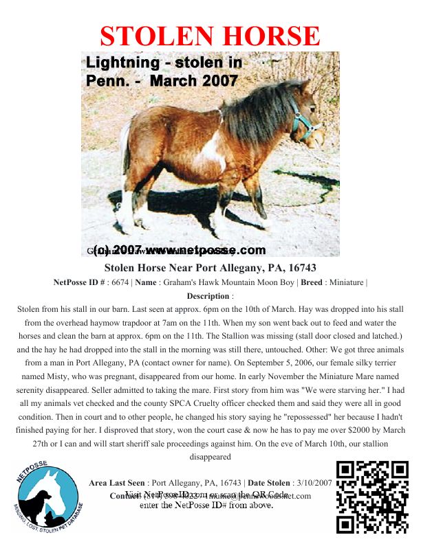 Description: Stolen from his stall in our barn. Last seen at approx. 6pm on the 10th of March. Hay was dropped into his stall from the overhead haymow trapdoor at 7am on the 11th. When my son went back out to feed and water the horses and clean the barn at approx. 6pm on the 11th. The Stallion was missing (stall door closed and latched.) and the hay he had dropped into the stall in the morning was still there, untouched. Other: We got three animals from a man in Port Allegany, PA (contact owner for name). On September 5, 2006, our female silky terrier named Misty, who was pregnant, disappeared from our home. In early November the Miniature Mare named serenity disappeared. Seller admitted to taking the mare. First story from him was "We were starving her." I had all my animals vet checked and the county SPCA Cruelty officer checked them and said they were all in good condition. Then in court and to other people, he changed his story saying he "repossessed" her because I hadn't finished paying for her. I disproved that story, won the court case & now he has to pay me over $2000 by March 27th or I can and will start sheriff sale proceedings against him. On the eve of March 10th, our stallion disappeared