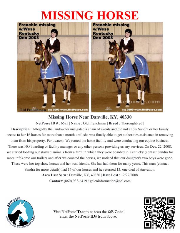 On Dec. 22, 2008, we started loading our starved animals from a farm in which they were boarded in Kentucky (contact Sandra for more info) onto our trailers and after we counted the horses, we noticed that our daughter's two boys were gone. These were her top show horses and her best friends. She has had them for many years. This man (contact Sandra for more details) had 16 of our horses and he returned 13, one died of starvation.