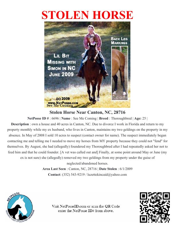 Description: own a house and 40 acres in Canton, NC. Due to divorce I work in Florida and return to my property monthly while my ex husband, who lives in Canton, maintains my two geldings on the property in my absence. In May of 2008 I sold 10 acres to suspect (contact owner for name). The suspect immediately began contacting me and telling me I needed to move my horses from MY property because they could not "fend" for themselves.