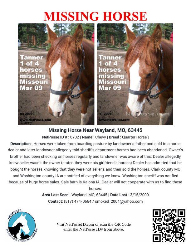 Description: Horses were taken from boarding pasture by landowner's father and sold to a horse dealer and later landowner allegedly told sheriff's department horses had been abandoned. Owner's brother had been checking on horses regularly and landowner was aware of this. Dealer allegedly knew seller wasn't the owner (stated they were his girlfriend's horses) Dealer has admitted that he bought the horses knowing that they were not seller's and then sold the horses. Clark county MO and Washington county IA are notified of everything we know. Washington sheriff was notified because of huge horse sales. Sale barn is Kalona IA. Dealer will not cooperate with us to find these horses.