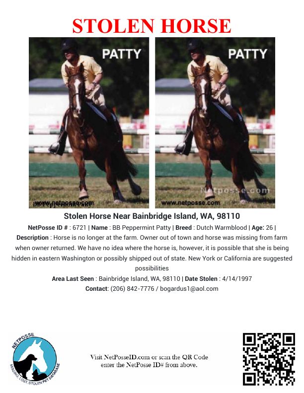 Description: Horse is no longer at the farm. Owner out of town and horse was missing from farm when owner returned. We have no idea where the horse is, however, it is possible that she is being hidden in eastern Washington or possibly shipped out of state. New York or California are suggested possibilities