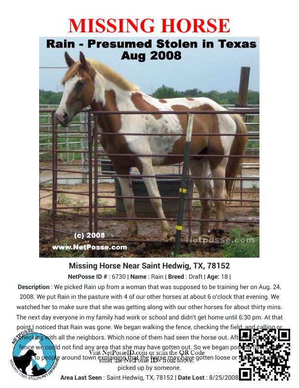 Description: We picked Rain up from a woman that was supposed to be training her on Aug. 24, 2008. We put Rain in the pasture with 4 of our other horses at about 6 o'clock that evening. We watched her to make sure that she was getting along with our other horses for about thirty mins. The next day everyone in my family had work or school and didn't get home until 6:30 pm. At that point I noticed that Rain was gone. We began walking the fence, checking the field, and calling or checking with all the neighbors. Which none of them had seen the horse out. After checking the fence we could not find any area that she may have gotten out. So we began posting flyers and talking to people around town explaining that the horse may have gotten loose or may have gotten picked up by someone.