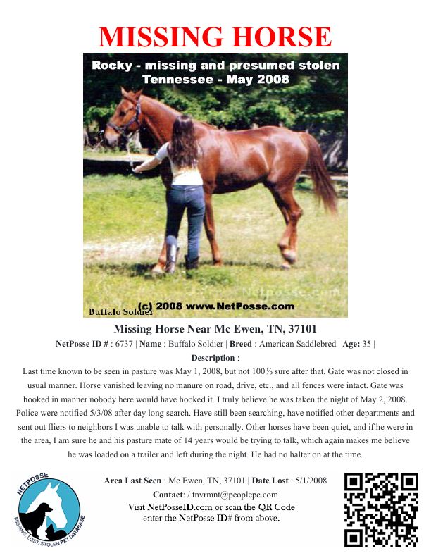Description: Last time known to be seen in pasture was May 1, 2008, but not 100% sure after that. Gate was not closed in usual manner. Horse vanished leaving no manure on road, drive, etc., and all fences were intact. Gate was hooked in manner nobody here would have hooked it. I truly believe he was taken the night of May 2, 2008. Police were notified 5/3/08 after day long search. Have still been searching, have notified other departments and sent out fliers to neighbors I was unable to talk with personally. Other horses have been quiet, and if he were in the area, I am sure he and his pasture mate of 14 years would be trying to talk, which again makes me believe he was loaded on a trailer and left during the night. He had no halter on at the time.