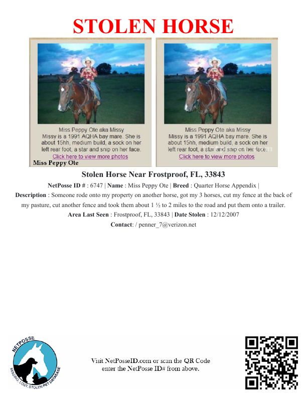 Description: Someone rode onto my property on another horse, got my 3 horses, cut my fence at the back of my pasture, cut another fence and took them about 1 ½ to 2 miles to the road and put them onto a trailer.