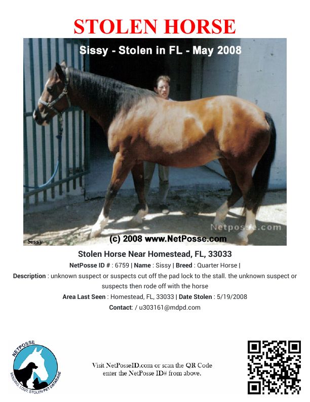 Description: unknown suspect or suspects cut off the pad lock to the stall. the unknown suspect or suspects then rode off with the horse